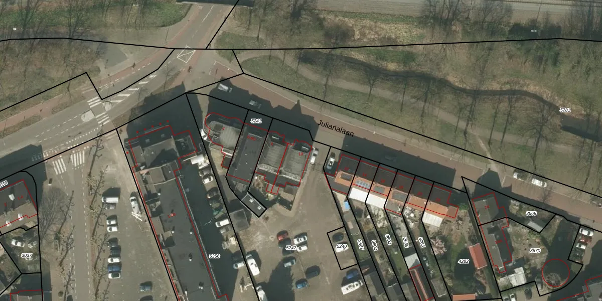 Julianalaan 10 is gelegen op kadastraal perceel WEE01R5242. Deze kadastrale aanduiding is uniek en wordt gebruikt door het Kadaster om eigendomsrechten en andere zakelijke rechten vast te leggen. Het perceel maakt onderdeel uit van de kadastrale gemeente Weert.