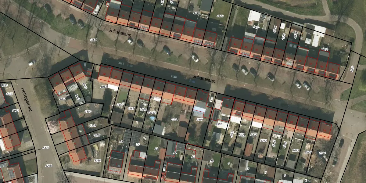 Het perceel waarop Julianalaan 50 staat heeft een oppervlakte van 562 m². Dit is een groot perceel. De perceeloppervlakte wordt geregistreerd door het Kadaster. Gedetailleerde informatie over de maten van dit perceel kunt u vinden in het rapport Kadastrale kaart met maatvoering van Julianalaan 50.