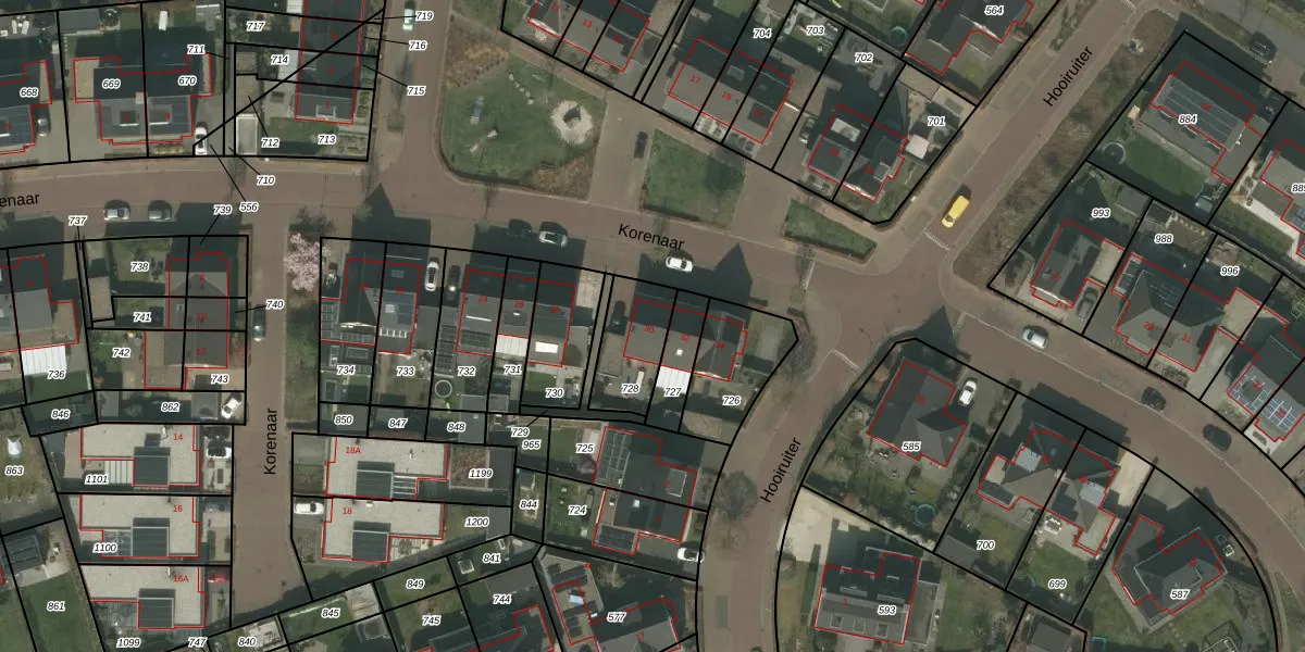 Het perceel waarop Korenaar 30 staat heeft een oppervlakte van 196 m². Dit is een middelgroot perceel. De perceeloppervlakte wordt geregistreerd door het Kadaster. Gedetailleerde informatie over de maten van dit perceel kunt u vinden in het rapport Kadastrale kaart met maatvoering van Korenaar 30.