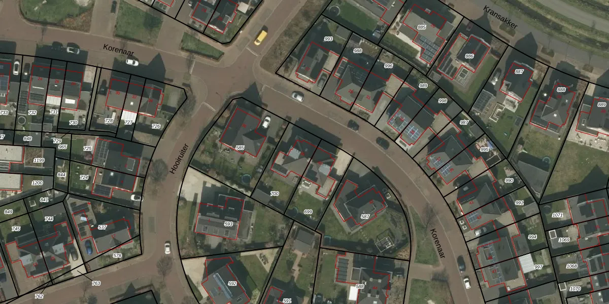 Het perceel waarop Korenaar 38 staat heeft een oppervlakte van 335 m². Dit is een groot perceel. De perceeloppervlakte wordt geregistreerd door het Kadaster. Gedetailleerde informatie over de maten van dit perceel kunt u vinden in het rapport Kadastrale kaart met maatvoering van Korenaar 38.