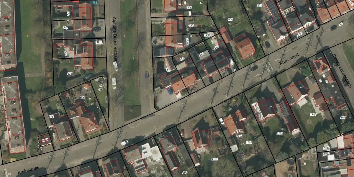 Het perceel waarop Kruisstraat 35 staat heeft een oppervlakte van 403 m². Dit is een groot perceel. De perceeloppervlakte wordt geregistreerd door het Kadaster. Gedetailleerde informatie over de maten van dit perceel kunt u vinden in het rapport Kadastrale kaart met maatvoering van Kruisstraat 35.