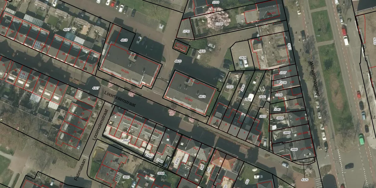 Het perceel waarop Looimolenstraat 16 staat heeft een oppervlakte van 436 m². Dit is een groot perceel. De perceeloppervlakte wordt geregistreerd door het Kadaster. Gedetailleerde informatie over de maten van dit perceel kunt u vinden in het rapport Kadastrale kaart met maatvoering van Looimolenstraat 16.