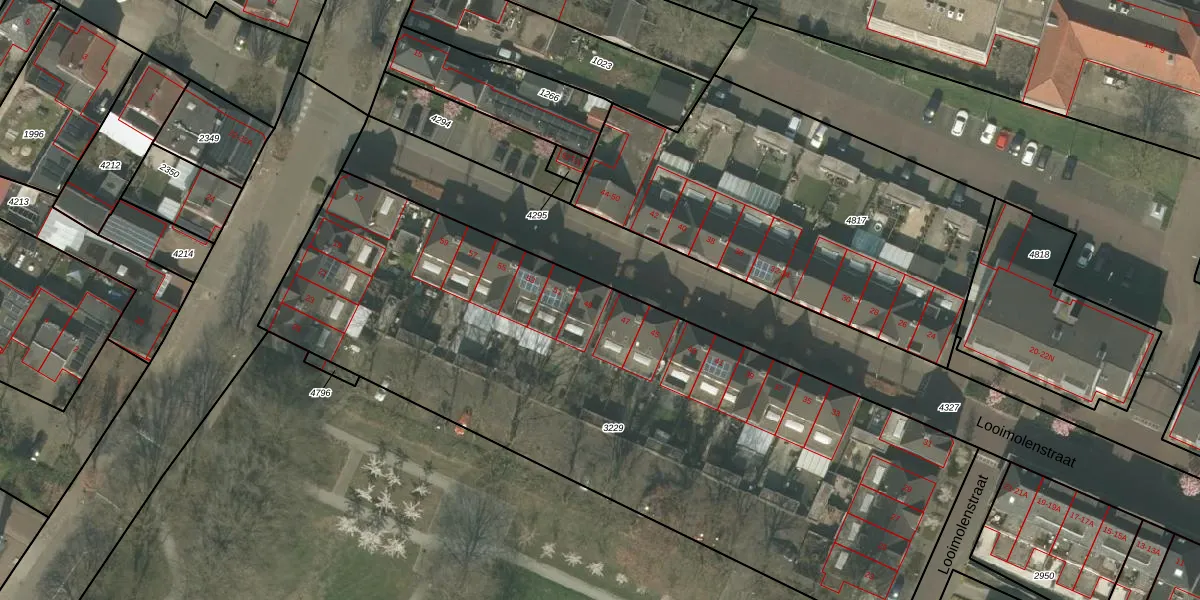 Het perceel waarop Looimolenstraat 49 staat heeft een oppervlakte van 3720 m². Dit is een zeer groot perceel. De perceeloppervlakte wordt geregistreerd door het Kadaster. Gedetailleerde informatie over de maten van dit perceel kunt u vinden in het rapport Kadastrale kaart met maatvoering van Looimolenstraat 49.