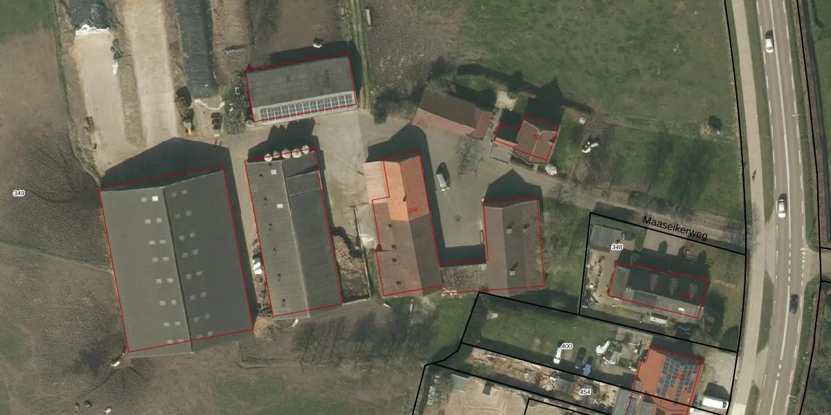 Het perceel waarop Maaseikerweg 218 staat heeft een oppervlakte van 4,7 ha. Dit is een zeer groot perceel. De perceeloppervlakte wordt geregistreerd door het Kadaster. Gedetailleerde informatie over de maten van dit perceel kunt u vinden in het rapport Kadastrale kaart met maatvoering van Maaseikerweg 218.