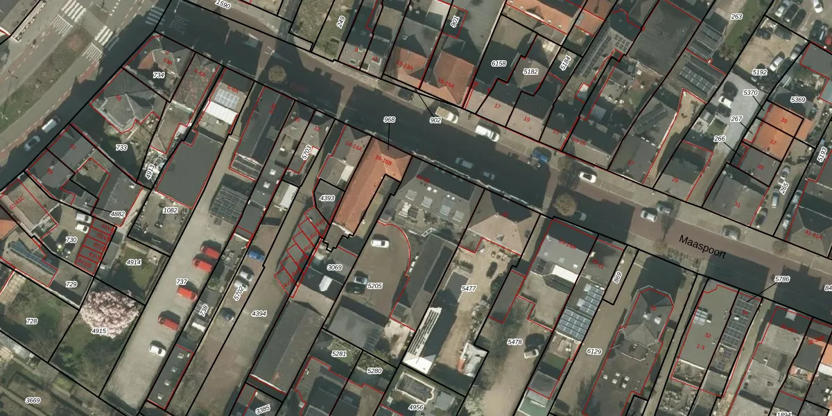 Het perceel waarop Maaspoort 18-B staat heeft een oppervlakte van 940 m². Dit is een groot perceel. De perceeloppervlakte wordt geregistreerd door het Kadaster. Gedetailleerde informatie over de maten van dit perceel kunt u vinden in het rapport Kadastrale kaart met maatvoering van Maaspoort 18-B.