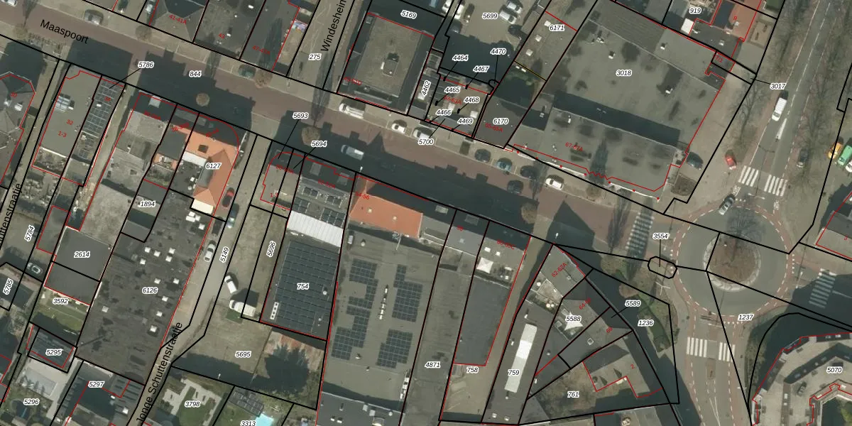 Maaspoort 54-B is gelegen op kadastraal perceel WEE01S4872. Deze kadastrale aanduiding is uniek en wordt gebruikt door het Kadaster om eigendomsrechten en andere zakelijke rechten vast te leggen. Het perceel maakt onderdeel uit van de kadastrale gemeente Weert.