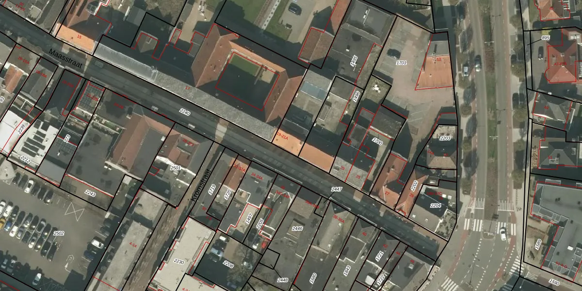 Maasstraat 21 is gelegen op kadastraal perceel WEE01O1495. Deze kadastrale aanduiding is uniek en wordt gebruikt door het Kadaster om eigendomsrechten en andere zakelijke rechten vast te leggen. Het perceel maakt onderdeel uit van de kadastrale gemeente Weert.