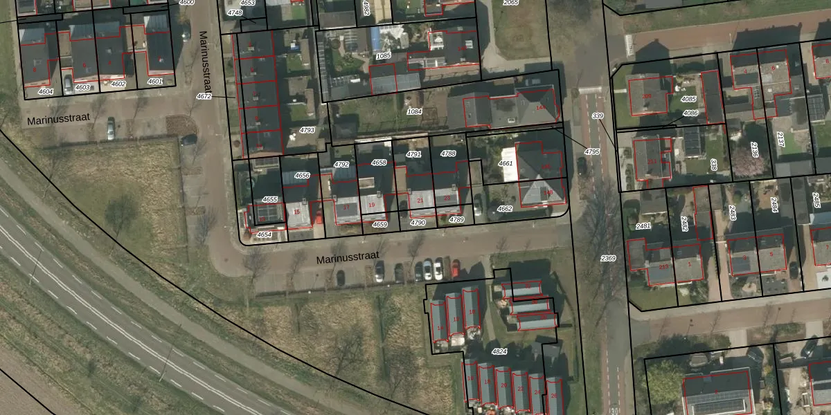 Marinusstraat 21 is gelegen op kadastraal perceel WEE01R4791. Deze kadastrale aanduiding is uniek en wordt gebruikt door het Kadaster om eigendomsrechten en andere zakelijke rechten vast te leggen. Het perceel maakt onderdeel uit van de kadastrale gemeente Weert.