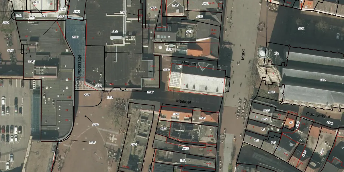 Het perceel waarop Markt 7 staat heeft een oppervlakte van 6807 m². Dit is een zeer groot perceel. De perceeloppervlakte wordt geregistreerd door het Kadaster. Gedetailleerde informatie over de maten van dit perceel kunt u vinden in het rapport Kadastrale kaart met maatvoering van Markt 7.