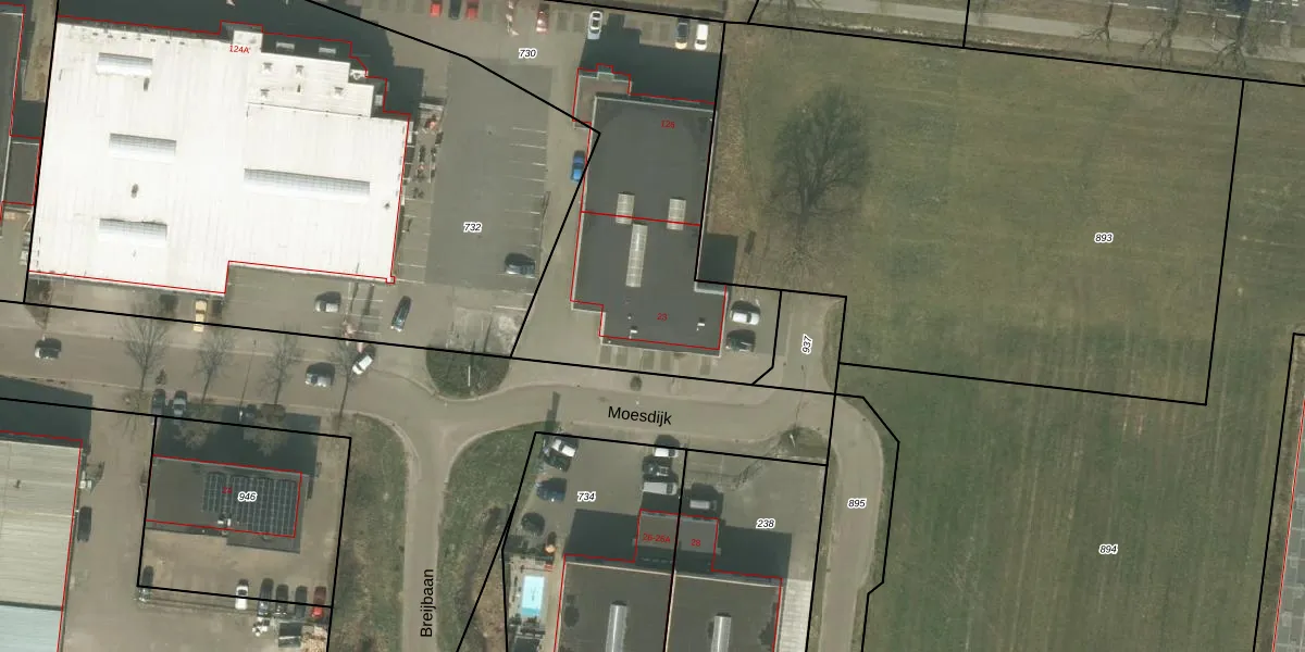 Het perceel waarop Moesdijk 23 staat heeft een oppervlakte van 1810 m². Dit is een zeer groot perceel. De perceeloppervlakte wordt geregistreerd door het Kadaster. Gedetailleerde informatie over de maten van dit perceel kunt u vinden in het rapport Kadastrale kaart met maatvoering van Moesdijk 23.