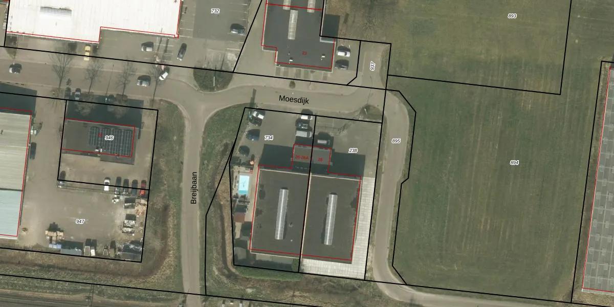 Het perceel waarop Moesdijk 26-A staat heeft een oppervlakte van 1228 m². Dit is een zeer groot perceel. De perceeloppervlakte wordt geregistreerd door het Kadaster. Gedetailleerde informatie over de maten van dit perceel kunt u vinden in het rapport Kadastrale kaart met maatvoering van Moesdijk 26-A.