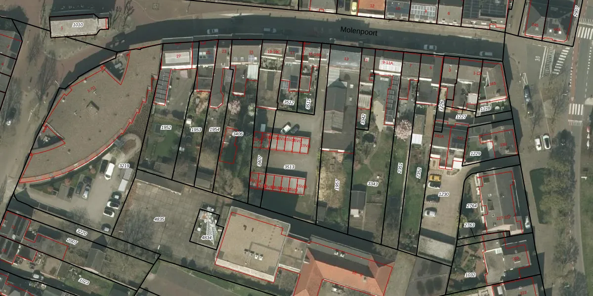 Het perceel waarop Molenpoort 15-V-2 staat heeft een oppervlakte van 755 m². Dit is een groot perceel. De perceeloppervlakte wordt geregistreerd door het Kadaster. Gedetailleerde informatie over de maten van dit perceel kunt u vinden in het rapport Kadastrale kaart met maatvoering van Molenpoort 15-V-2.