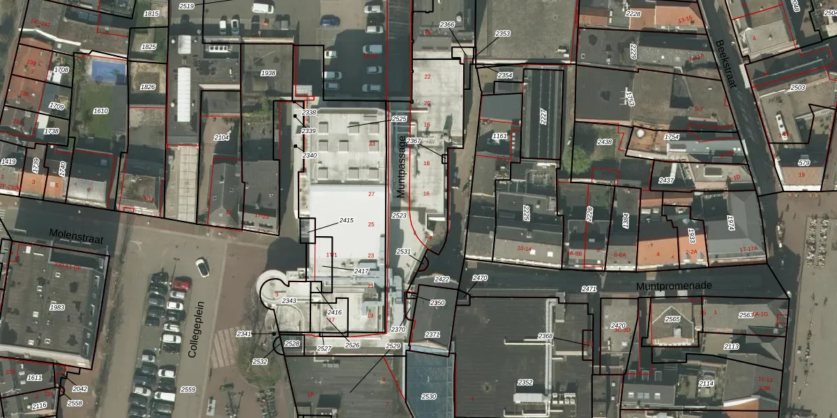 Het perceel waarop Muntpassage 16 staat heeft een oppervlakte van 955 m². Dit is een groot perceel. De perceeloppervlakte wordt geregistreerd door het Kadaster. Gedetailleerde informatie over de maten van dit perceel kunt u vinden in het rapport Kadastrale kaart met maatvoering van Muntpassage 16.