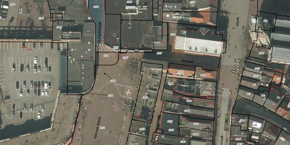 Het perceel waarop Nieuwe Markt 20-D staat heeft een oppervlakte van 562 m². Dit is een groot perceel. De perceeloppervlakte wordt geregistreerd door het Kadaster. Gedetailleerde informatie over de maten van dit perceel kunt u vinden in het rapport Kadastrale kaart met maatvoering van Nieuwe Markt 20-D.