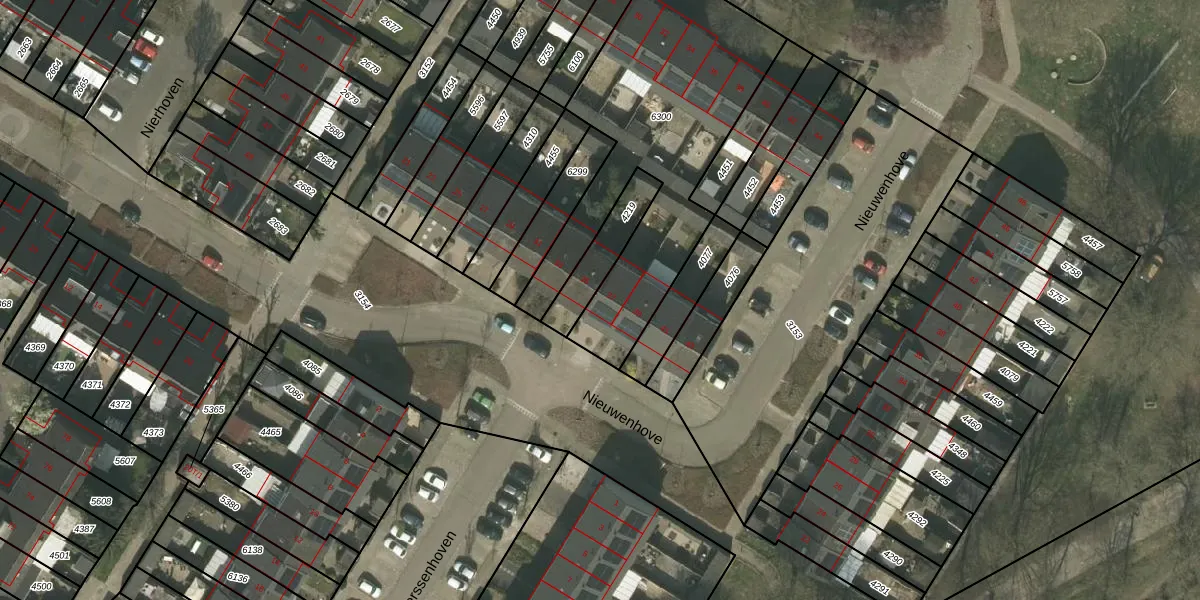 Het perceel waarop Nieuwenhove 37 staat heeft een oppervlakte van 1244 m². Dit is een zeer groot perceel. De perceeloppervlakte wordt geregistreerd door het Kadaster. Gedetailleerde informatie over de maten van dit perceel kunt u vinden in het rapport Kadastrale kaart met maatvoering van Nieuwenhove 37.