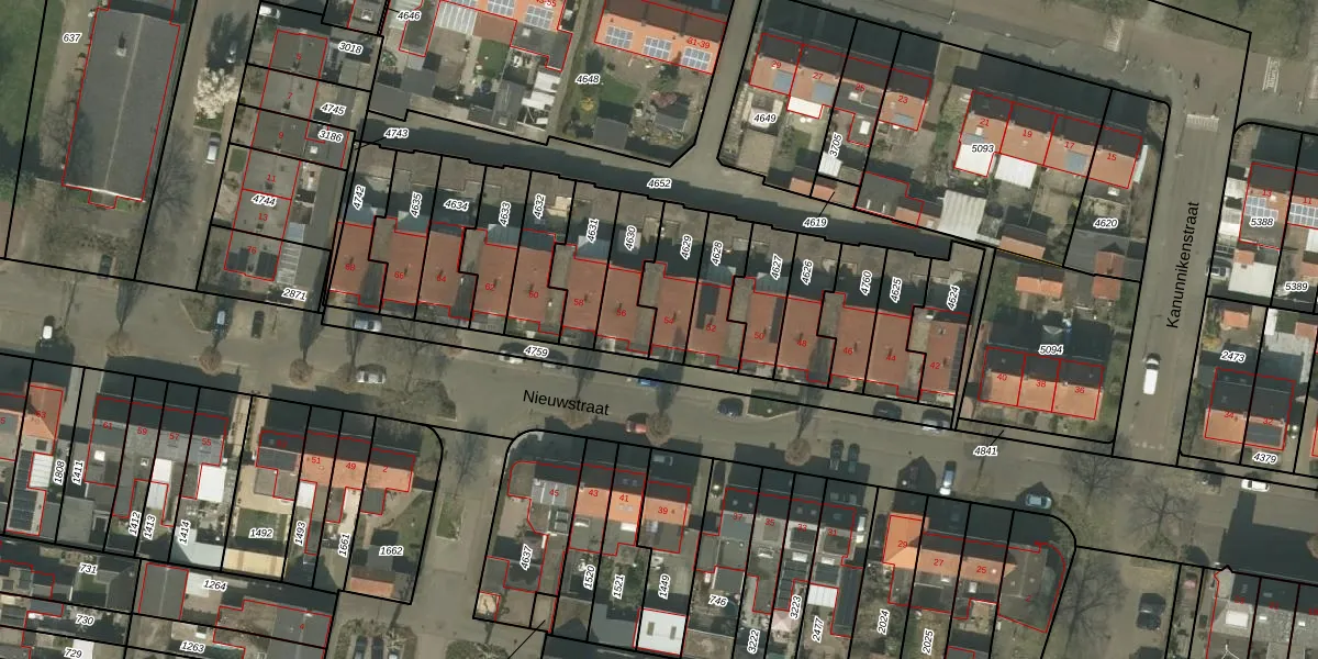 Het perceel waarop Nieuwstraat 54 staat heeft een oppervlakte van 162 m². Dit is een middelgroot perceel. De perceeloppervlakte wordt geregistreerd door het Kadaster. Gedetailleerde informatie over de maten van dit perceel kunt u vinden in het rapport Kadastrale kaart met maatvoering van Nieuwstraat 54.