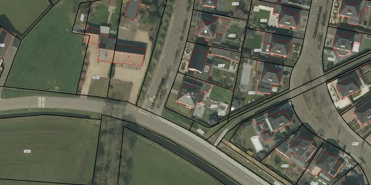 Het perceel waarop Odahoevestraat 63 staat heeft een oppervlakte van 702 m². Dit is een groot perceel. De perceeloppervlakte wordt geregistreerd door het Kadaster. Gedetailleerde informatie over de maten van dit perceel kunt u vinden in het rapport Kadastrale kaart met maatvoering van Odahoevestraat 63.