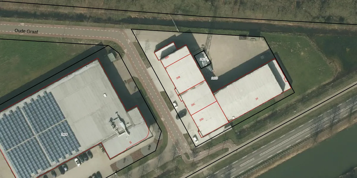 Het perceel waarop Oude Graaf 20-B staat heeft een oppervlakte van 3448 m². Dit is een zeer groot perceel. De perceeloppervlakte wordt geregistreerd door het Kadaster. Gedetailleerde informatie over de maten van dit perceel kunt u vinden in het rapport Kadastrale kaart met maatvoering van Oude Graaf 20-B.