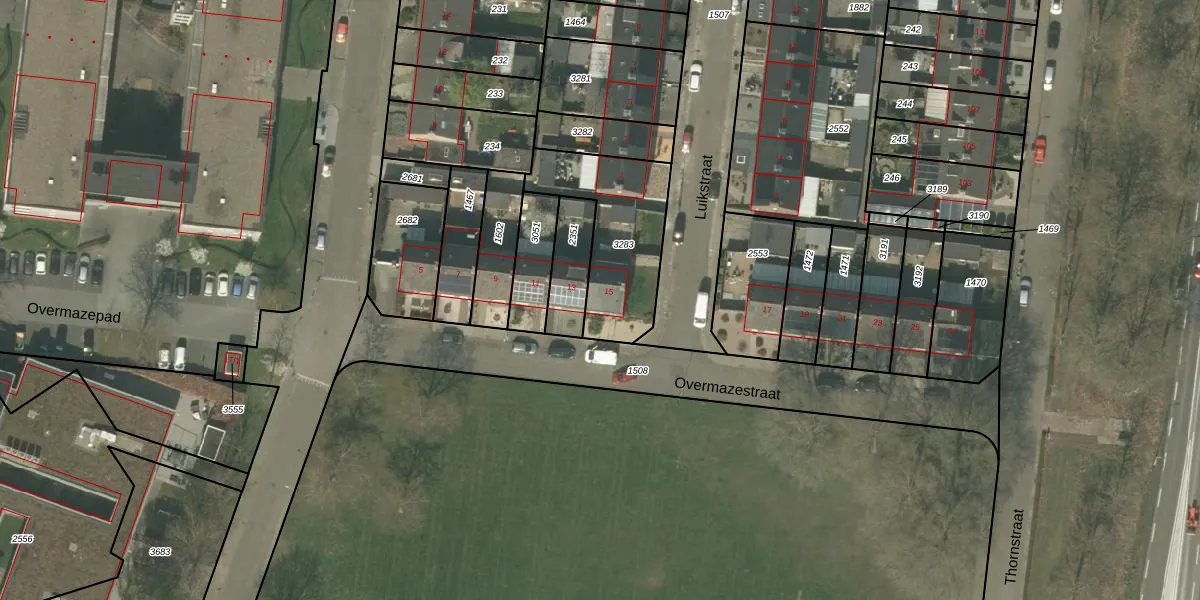 Overmazestraat 15 is gelegen op kadastraal perceel WEE01T3283. Deze kadastrale aanduiding is uniek en wordt gebruikt door het Kadaster om eigendomsrechten en andere zakelijke rechten vast te leggen. Het perceel maakt onderdeel uit van de kadastrale gemeente Weert.