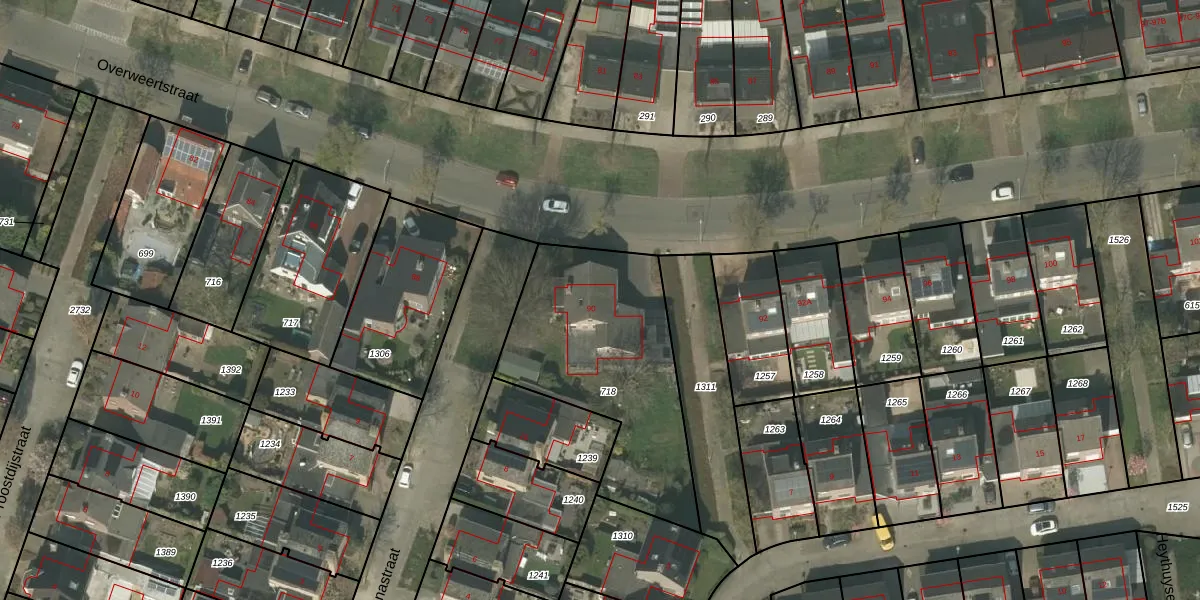 Het perceel waarop Overweertstraat 90 staat heeft een oppervlakte van 910 m². Dit is een groot perceel. De perceeloppervlakte wordt geregistreerd door het Kadaster. Gedetailleerde informatie over de maten van dit perceel kunt u vinden in het rapport Kadastrale kaart met maatvoering van Overweertstraat 90.