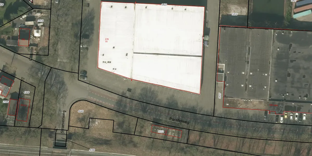 Het perceel waarop Parallelweg 170 staat heeft een oppervlakte van 8145 m². Dit is een zeer groot perceel. De perceeloppervlakte wordt geregistreerd door het Kadaster. Gedetailleerde informatie over de maten van dit perceel kunt u vinden in het rapport Kadastrale kaart met maatvoering van Parallelweg 170.