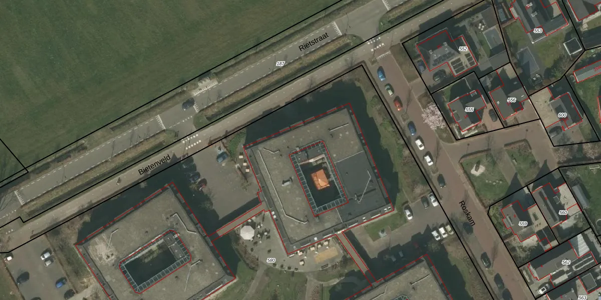 Het perceel waarop Rietstraat 2-B-07 staat heeft een oppervlakte van 1,3 ha. Dit is een zeer groot perceel. De perceeloppervlakte wordt geregistreerd door het Kadaster. Gedetailleerde informatie over de maten van dit perceel kunt u vinden in het rapport Kadastrale kaart met maatvoering van Rietstraat 2-B-07.