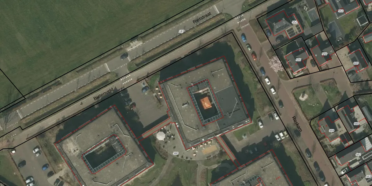 Het perceel waarop Rietstraat 2-B-09 staat heeft een oppervlakte van 1,3 ha. Dit is een zeer groot perceel. De perceeloppervlakte wordt geregistreerd door het Kadaster. Gedetailleerde informatie over de maten van dit perceel kunt u vinden in het rapport Kadastrale kaart met maatvoering van Rietstraat 2-B-09.