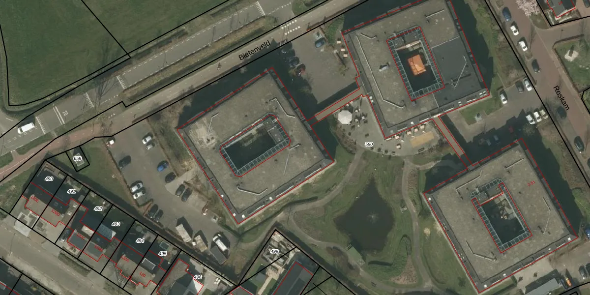 Het perceel waarop Rietstraat 2-A-04 staat heeft een oppervlakte van 1,3 ha. Dit is een zeer groot perceel. De perceeloppervlakte wordt geregistreerd door het Kadaster. Gedetailleerde informatie over de maten van dit perceel kunt u vinden in het rapport Kadastrale kaart met maatvoering van Rietstraat 2-A-04.