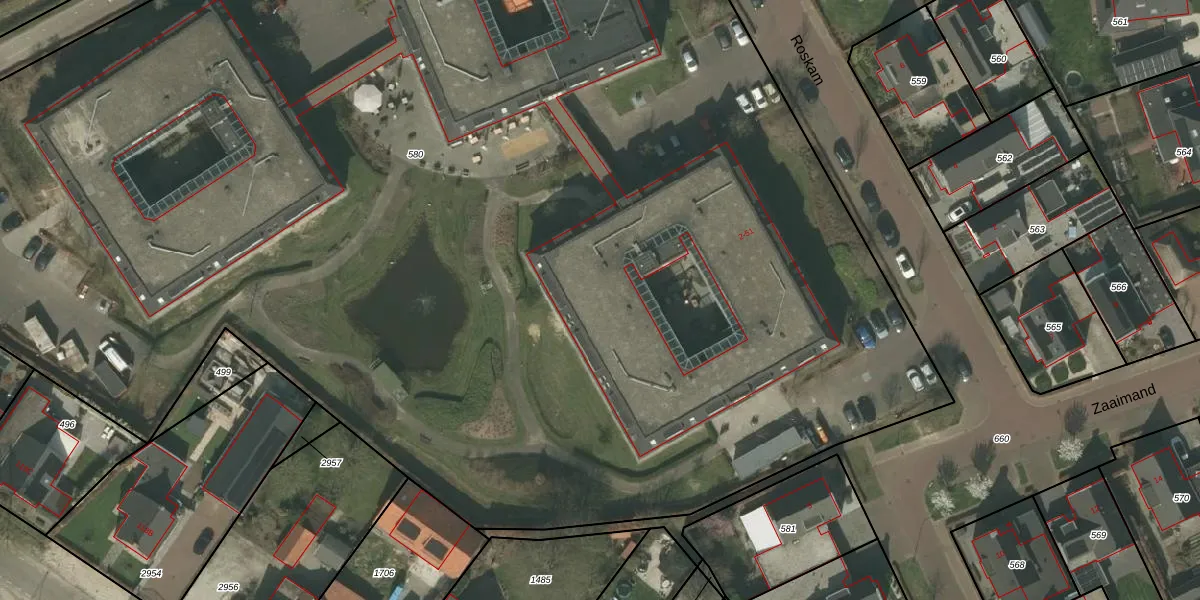 Het perceel waarop Roskam 35 staat heeft een oppervlakte van 1,3 ha. Dit is een zeer groot perceel. De perceeloppervlakte wordt geregistreerd door het Kadaster. Gedetailleerde informatie over de maten van dit perceel kunt u vinden in het rapport Kadastrale kaart met maatvoering van Roskam 35.