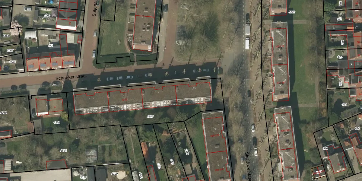 Het perceel waarop Schaekenstraat 42 staat heeft een oppervlakte van 1775 m². Dit is een zeer groot perceel. De perceeloppervlakte wordt geregistreerd door het Kadaster. Gedetailleerde informatie over de maten van dit perceel kunt u vinden in het rapport Kadastrale kaart met maatvoering van Schaekenstraat 42.