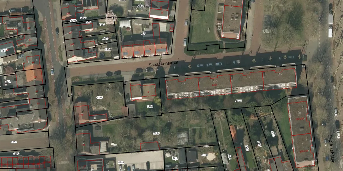 Het perceel waarop Schaekenstraat 6 staat heeft een oppervlakte van 1775 m². Dit is een zeer groot perceel. De perceeloppervlakte wordt geregistreerd door het Kadaster. Gedetailleerde informatie over de maten van dit perceel kunt u vinden in het rapport Kadastrale kaart met maatvoering van Schaekenstraat 6.