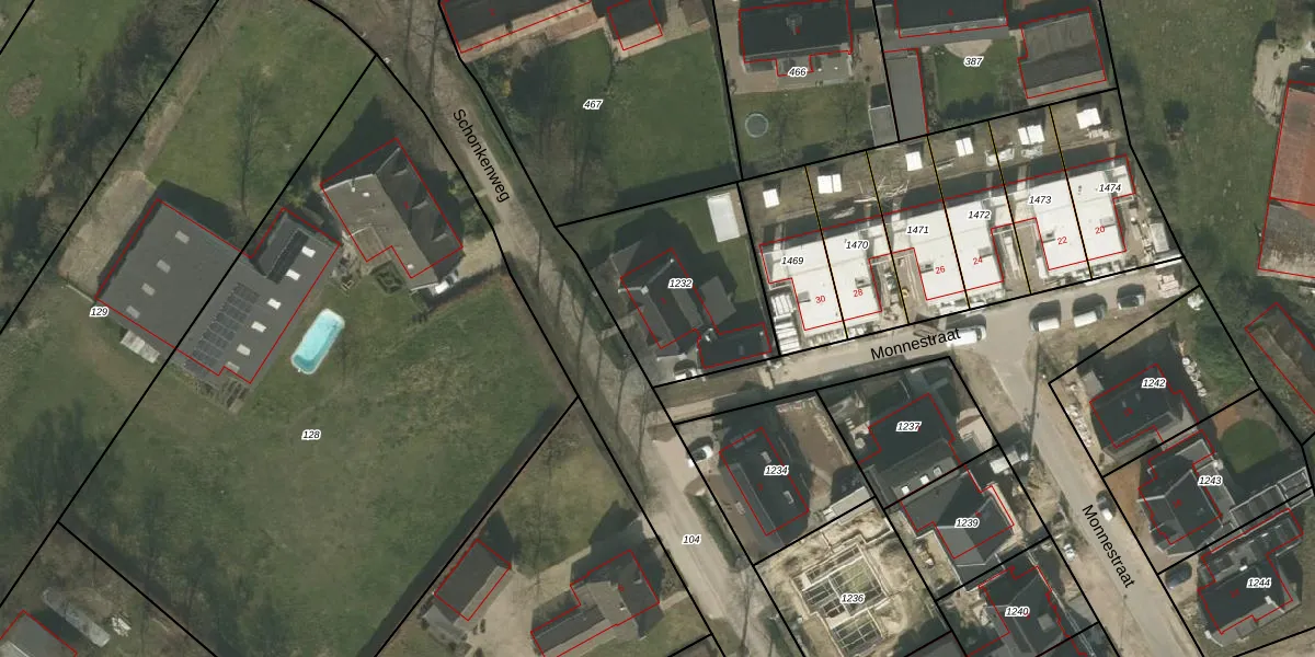 Het perceel waarop Schonkenweg 1 staat heeft een oppervlakte van 652 m². Dit is een groot perceel. De perceeloppervlakte wordt geregistreerd door het Kadaster. Gedetailleerde informatie over de maten van dit perceel kunt u vinden in het rapport Kadastrale kaart met maatvoering van Schonkenweg 1.