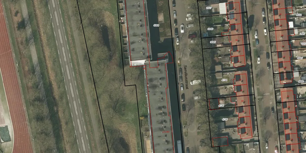 Het perceel waarop Serviliusstraat 198 staat heeft een oppervlakte van 4620 m². Dit is een zeer groot perceel. De perceeloppervlakte wordt geregistreerd door het Kadaster. Gedetailleerde informatie over de maten van dit perceel kunt u vinden in het rapport Kadastrale kaart met maatvoering van Serviliusstraat 198.