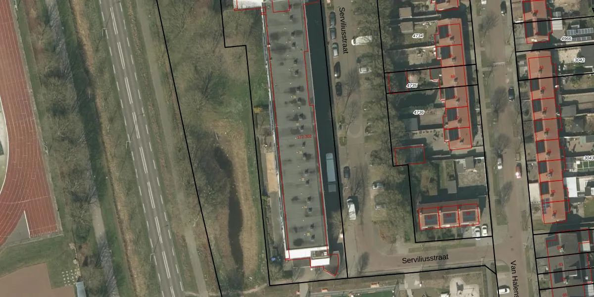 Het perceel waarop Serviliusstraat 260 staat heeft een oppervlakte van 4620 m². Dit is een zeer groot perceel. De perceeloppervlakte wordt geregistreerd door het Kadaster. Gedetailleerde informatie over de maten van dit perceel kunt u vinden in het rapport Kadastrale kaart met maatvoering van Serviliusstraat 260.