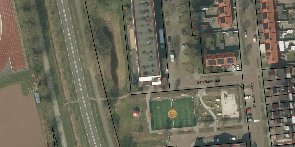 Het perceel waarop Serviliusstraat 300 staat heeft een oppervlakte van 4620 m². Dit is een zeer groot perceel. De perceeloppervlakte wordt geregistreerd door het Kadaster. Gedetailleerde informatie over de maten van dit perceel kunt u vinden in het rapport Kadastrale kaart met maatvoering van Serviliusstraat 300.