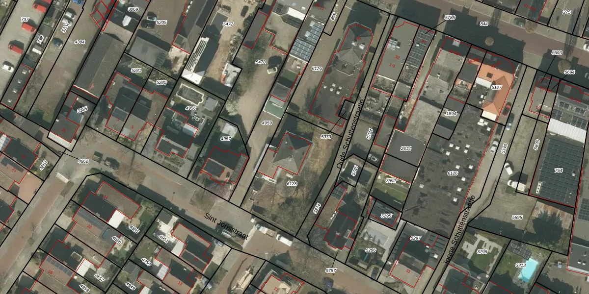 Het perceel waarop Sint Jorisstraat 25 staat heeft een oppervlakte van 834 m². Dit is een groot perceel. De perceeloppervlakte wordt geregistreerd door het Kadaster. Gedetailleerde informatie over de maten van dit perceel kunt u vinden in het rapport Kadastrale kaart met maatvoering van Sint Jorisstraat 25.