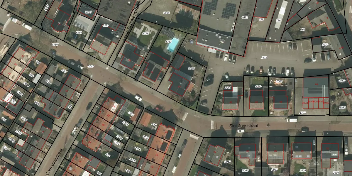 Het perceel waarop Sint Jorisstraat 37 staat heeft een oppervlakte van 545 m². Dit is een groot perceel. De perceeloppervlakte wordt geregistreerd door het Kadaster. Gedetailleerde informatie over de maten van dit perceel kunt u vinden in het rapport Kadastrale kaart met maatvoering van Sint Jorisstraat 37.