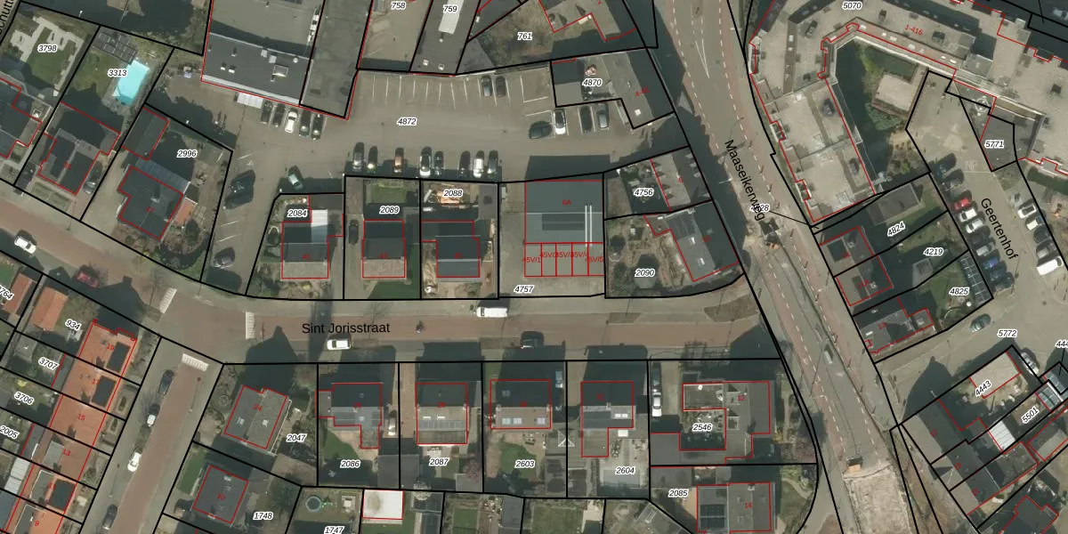 Sint Jorisstraat 45-V-1 is gelegen op kadastraal perceel WEE01S4757. Deze kadastrale aanduiding is uniek en wordt gebruikt door het Kadaster om eigendomsrechten en andere zakelijke rechten vast te leggen. Het perceel maakt onderdeel uit van de kadastrale gemeente Weert.