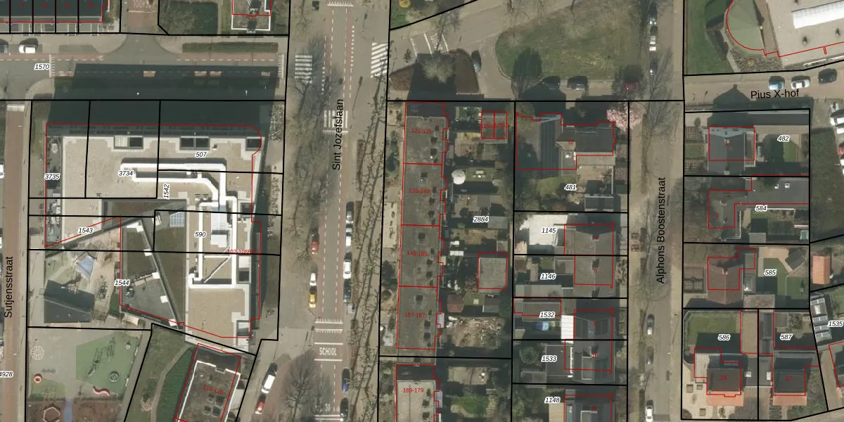 Het perceel waarop Sint Jozefslaan 141 staat heeft een oppervlakte van 1885 m². Dit is een zeer groot perceel. De perceeloppervlakte wordt geregistreerd door het Kadaster. Gedetailleerde informatie over de maten van dit perceel kunt u vinden in het rapport Kadastrale kaart met maatvoering van Sint Jozefslaan 141.