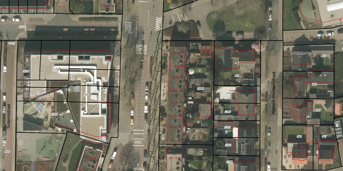 Het perceel waarop Sint Jozefslaan 143 staat heeft een oppervlakte van 1885 m². Dit is een zeer groot perceel. De perceeloppervlakte wordt geregistreerd door het Kadaster. Gedetailleerde informatie over de maten van dit perceel kunt u vinden in het rapport Kadastrale kaart met maatvoering van Sint Jozefslaan 143.