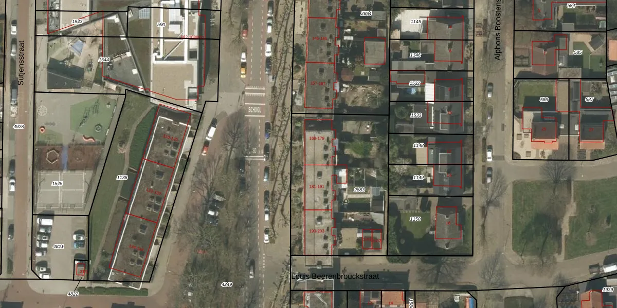 Het perceel waarop Sint Jozefslaan 179 staat heeft een oppervlakte van 1445 m². Dit is een zeer groot perceel. De perceeloppervlakte wordt geregistreerd door het Kadaster. Gedetailleerde informatie over de maten van dit perceel kunt u vinden in het rapport Kadastrale kaart met maatvoering van Sint Jozefslaan 179.