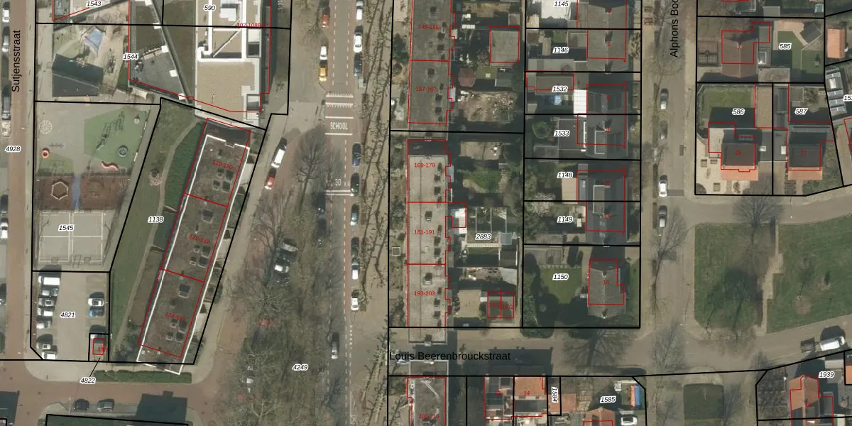 Het perceel waarop Sint Jozefslaan 183 staat heeft een oppervlakte van 1445 m². Dit is een zeer groot perceel. De perceeloppervlakte wordt geregistreerd door het Kadaster. Gedetailleerde informatie over de maten van dit perceel kunt u vinden in het rapport Kadastrale kaart met maatvoering van Sint Jozefslaan 183.