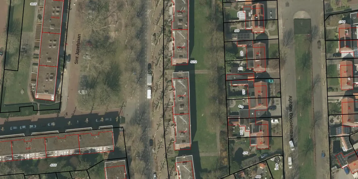 Het perceel waarop Sint Jozefslaan 269 staat heeft een oppervlakte van 6257 m². Dit is een zeer groot perceel. De perceeloppervlakte wordt geregistreerd door het Kadaster. Gedetailleerde informatie over de maten van dit perceel kunt u vinden in het rapport Kadastrale kaart met maatvoering van Sint Jozefslaan 269.