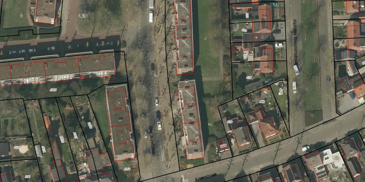 Het perceel waarop Sint Jozefslaan 289 staat heeft een oppervlakte van 6257 m². Dit is een zeer groot perceel. De perceeloppervlakte wordt geregistreerd door het Kadaster. Gedetailleerde informatie over de maten van dit perceel kunt u vinden in het rapport Kadastrale kaart met maatvoering van Sint Jozefslaan 289.