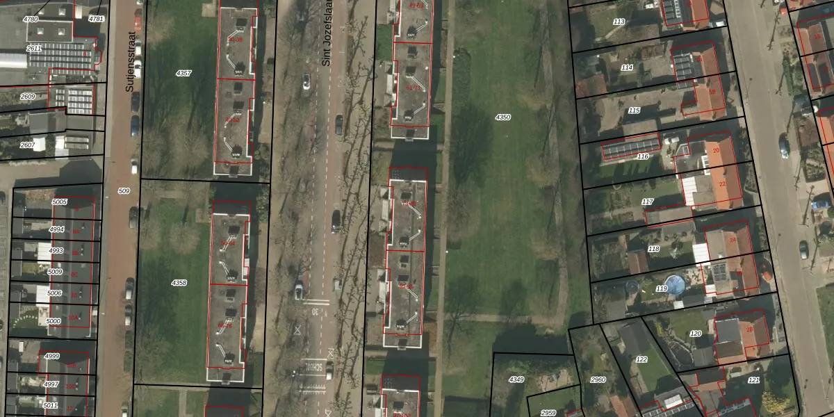 Het perceel waarop Sint Jozefslaan 79 staat heeft een oppervlakte van 8660 m². Dit is een zeer groot perceel. De perceeloppervlakte wordt geregistreerd door het Kadaster. Gedetailleerde informatie over de maten van dit perceel kunt u vinden in het rapport Kadastrale kaart met maatvoering van Sint Jozefslaan 79.