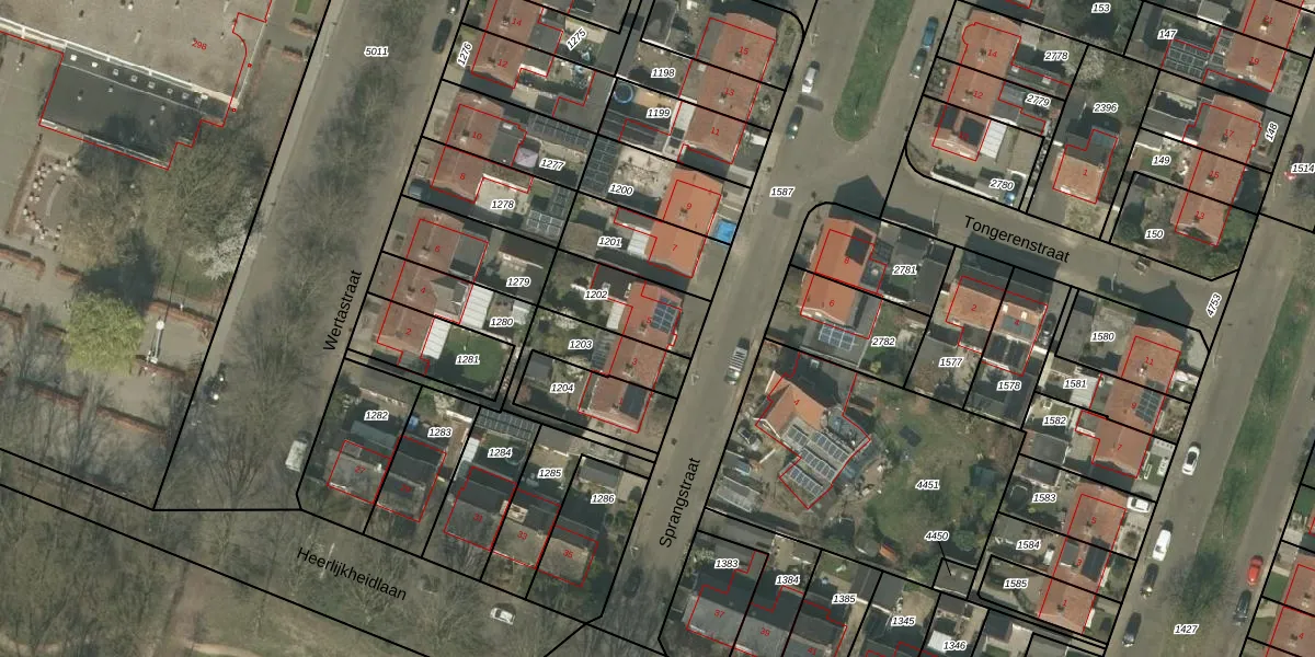 Sprangstraat 5 is gelegen op kadastraal perceel WEE01S1202. Deze kadastrale aanduiding is uniek en wordt gebruikt door het Kadaster om eigendomsrechten en andere zakelijke rechten vast te leggen. Het perceel maakt onderdeel uit van de kadastrale gemeente Weert.
