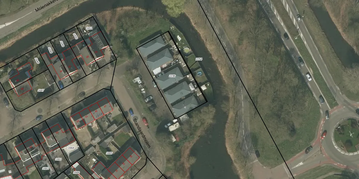 Het perceel waarop Standaardmolen 64 staat heeft een oppervlakte van 900 m². Dit is een groot perceel. De perceeloppervlakte wordt geregistreerd door het Kadaster. Gedetailleerde informatie over de maten van dit perceel kunt u vinden in het rapport Kadastrale kaart met maatvoering van Standaardmolen 64.