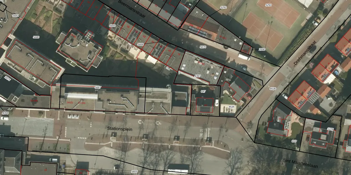 Het perceel waarop Stationsplein 115 staat heeft een oppervlakte van 5596 m². Dit is een zeer groot perceel. De perceeloppervlakte wordt geregistreerd door het Kadaster. Gedetailleerde informatie over de maten van dit perceel kunt u vinden in het rapport Kadastrale kaart met maatvoering van Stationsplein 115.