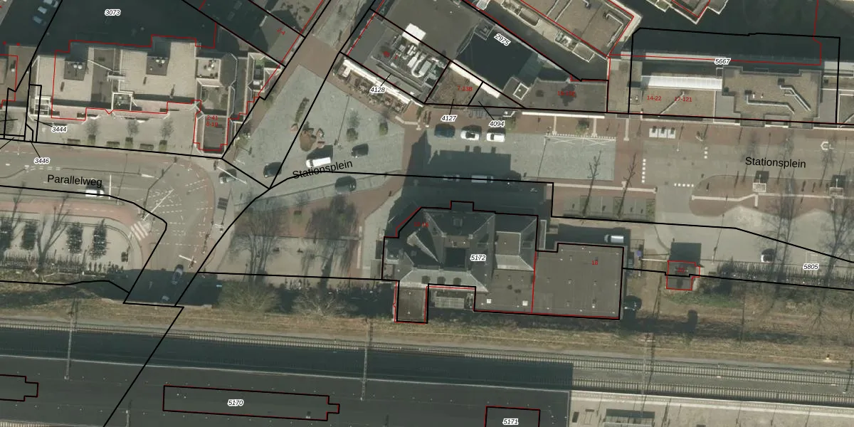 Het perceel waarop Stationsplein 12 staat heeft een oppervlakte van 1070 m². Dit is een zeer groot perceel. De perceeloppervlakte wordt geregistreerd door het Kadaster. Gedetailleerde informatie over de maten van dit perceel kunt u vinden in het rapport Kadastrale kaart met maatvoering van Stationsplein 12.