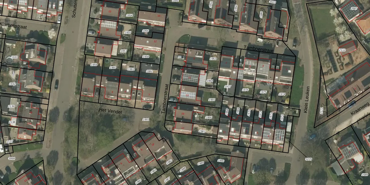 Het perceel waarop Tamboerstraat 13 staat heeft een oppervlakte van 286 m². Dit is een middelgroot perceel. De perceeloppervlakte wordt geregistreerd door het Kadaster. Gedetailleerde informatie over de maten van dit perceel kunt u vinden in het rapport Kadastrale kaart met maatvoering van Tamboerstraat 13.